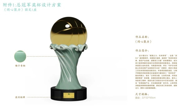 The championship trophy features a wave-like body holding a golden basketball, with a base inspired by Liangzhu jade cong. The medals uniquely combine celadon with metalwork, with the reverse side depicting game moments in relief.