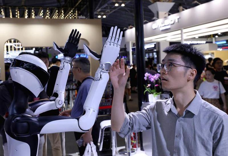 A visitor interacts with a robot equipped with intelligent dexterous hands at the 2025 World AI Conference in East China's Shanghai, July 29, 2025. [Photo/Xinhua]