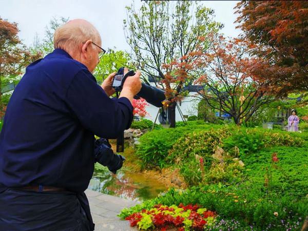 A visitor takes photos in the Huzhou Garden. [Photo/WeChat account: huzhoufabu]