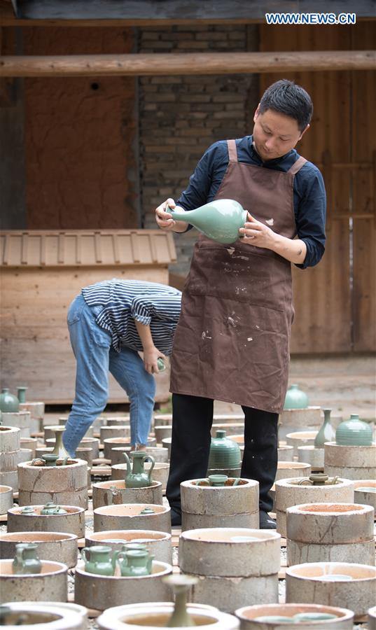 Liu Jie, born in 1985, is a celadon maker in Longquan City of Zhejiang Province. In 2016, he closed his studio and moved to a mountain with his family in the southern suburb of Longquan, where he built a kiln for Longquan celadon and researched on the traditional making of celadon. Liu follows the traditional way of celadon making of the Song Dynasty (960-1279) and does all the procedures personally. His kiln works four or five times a year, and during each time he has to add firewood for continuous ten plus hours and cool down the kiln naturally for two days. (Xinhua/Weng Xinyang)