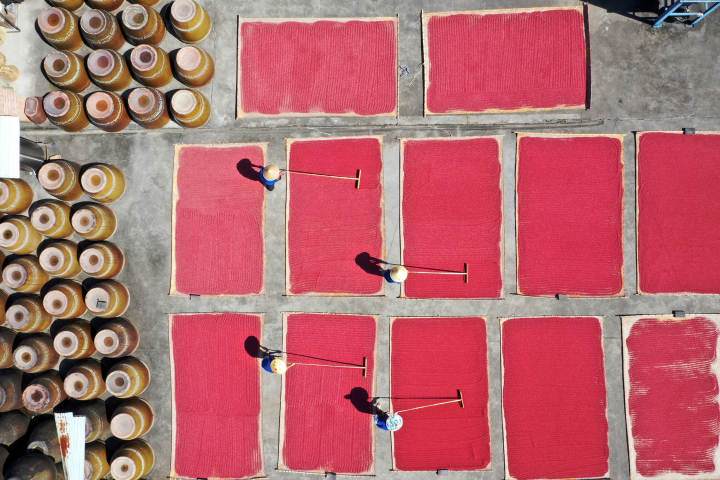 In the Qinglian Winery of Zhongshan Natural Village, Tuliang Village, Mazhai Town, Dongyang City, the master brewer is turning over the red koji, and it is very gratifying under the aerial camera.