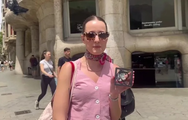 A woman in Barcelona holds a Wenzhou intangible cultural heritage item. [Photo/WeChat account: haiwaifabu]