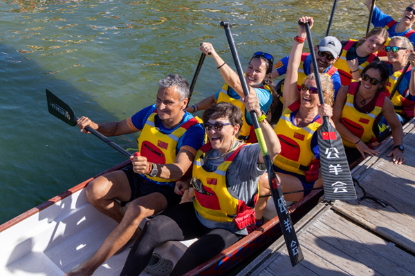 Six dragon boat teams from China and Spain competed fiercely in three groups, slicing through the azure waters. The rhythmic drumbeats and synchronized paddling created a thrilling spectacle, while the shores echoed with the cheers of thousands of spectators, both Chinese and international.