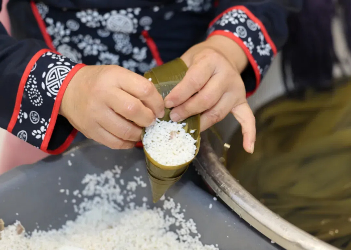 The stuffing for zongzi is mainly glutinous rice, which needs to be soaked for about half a day before packaging, being drained and then mixed with vegetable oil. Fillings, including egg yolks, candied dates, bacon and sausages, are used to add flavor.