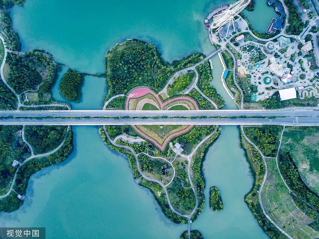 Aerial photo taken in June 2018 shows a heart-shaped island at Central Park, Zhenjiang, Jiangsu Province, China. (VCG)