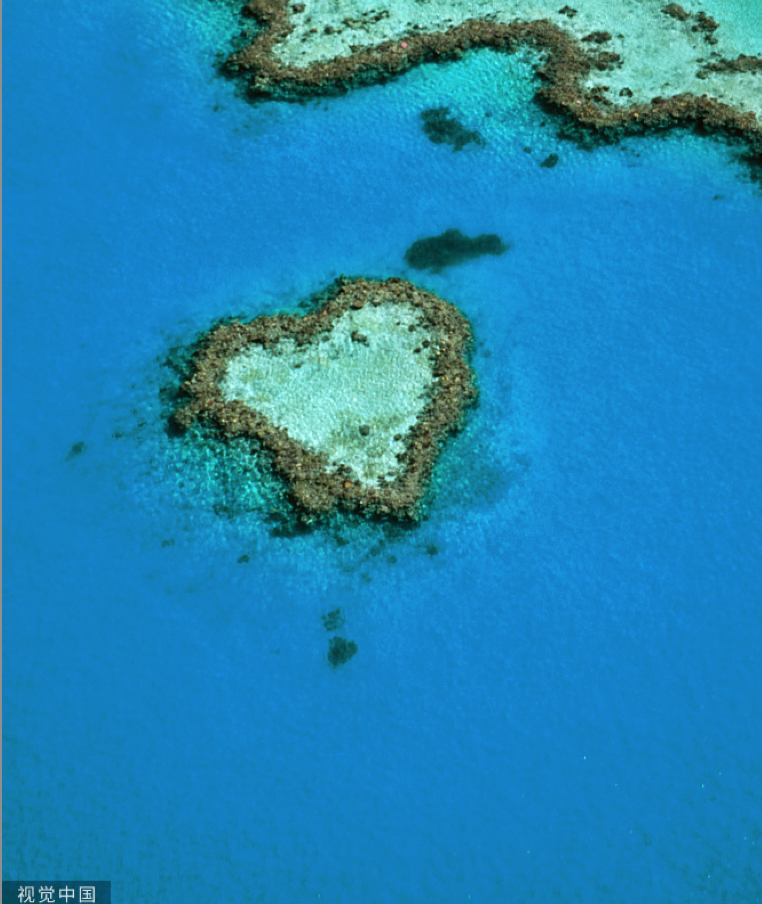 Aerial view of the aptly named Heart Reef, a heart-shaped coral reef in the Coral Sea, in the Great Barrier Reef, Whitsunday Islands off the coast of Queensland, Australia. (VCG)
