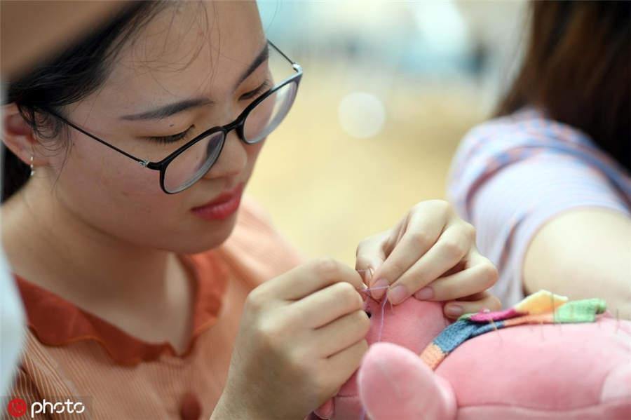 A woman shows her needlework in Nanshan city, Chongqing municipality, Aug 6, 2019.