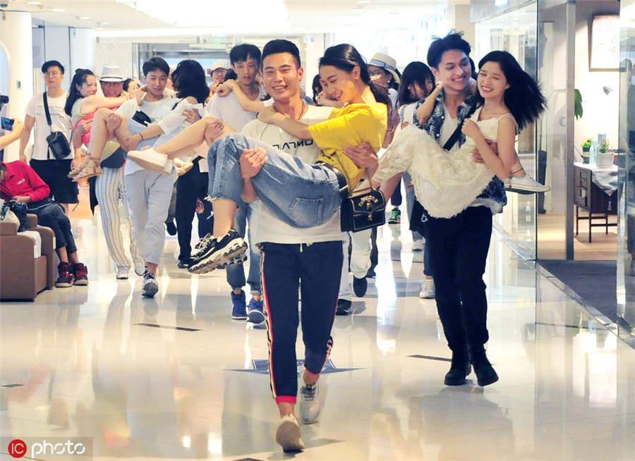 A special running contest is held at a shopping mall in Shanghai to celebrate the Qixi Festival, Aug 6, 2019.