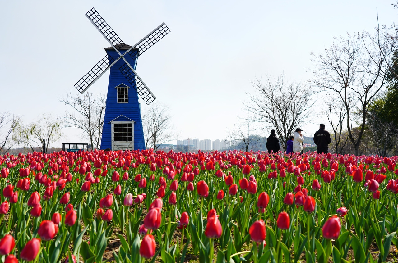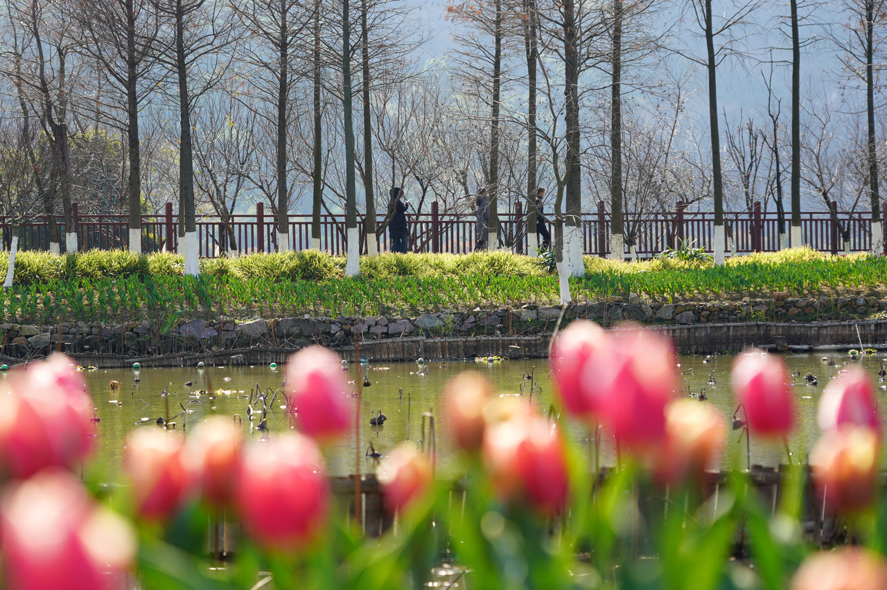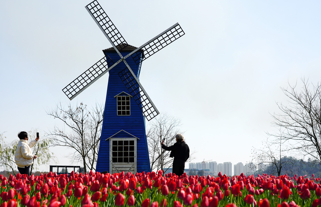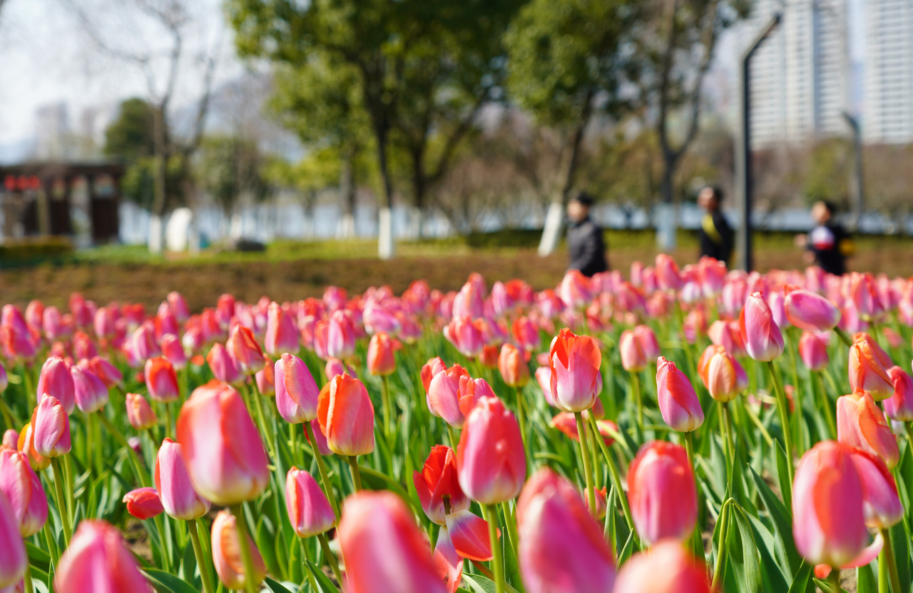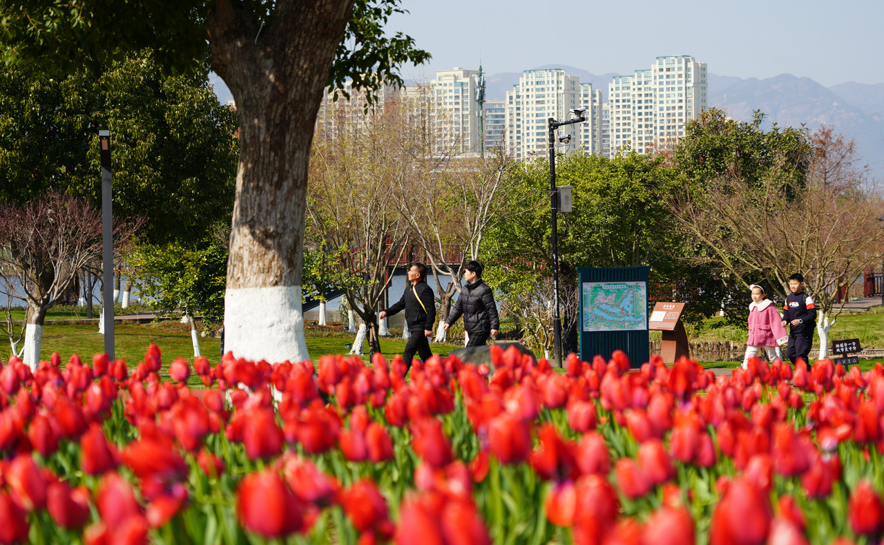 Tens of thousands of tulips bloom under the bright sunshine in Qinghe Park, Yueqing City, attracting residents to take photos of the flowers.