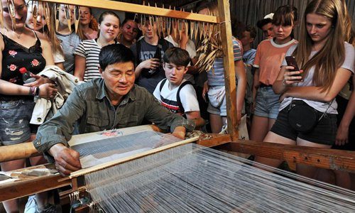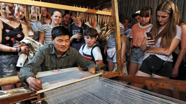 Wang Yishi, a local sericulturist, shows traditional silk processing skill for visitors at the silk museum in Jili village of Nanxun District, Huzhou City, east China's Zhejiang Province, May 23, 2019. The museum exhibits the local sericulturist Wang Yishi's collection of tools for silkworm raising. (Xinhua/Tan Jin)