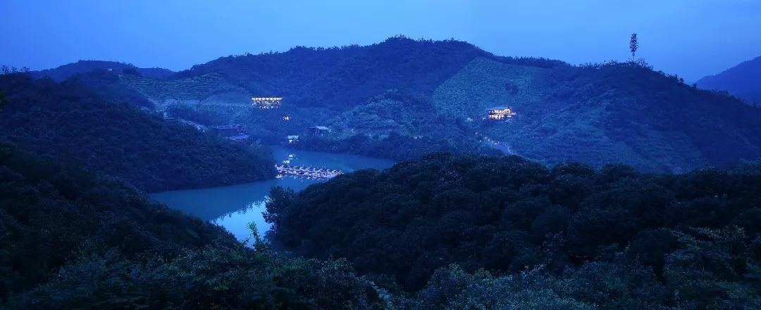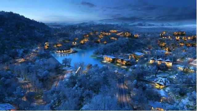 As night falls, the Jun’anli Holiday Resort, illuminated by the lights, shines like a pearl at the foot of the mountain.