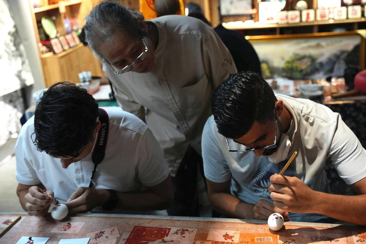 With the help of Ye Lihui, an inheritor of the craft who is vice president of the Pingyang County Intangible Cultural Heritage Protection Association, Mohammed Fadhl Mohammed Al-Zouba from Yemen and Douglas Dueno from the US had a go.