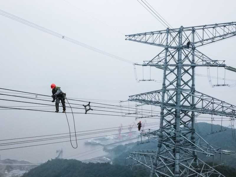 Aerial photo shows technicians of State Grid Zhejiang Electric Power Company checking power transmission lines to make sure the stable operation of local power supply in Zhoushan, east China's Zhejiang Province, Oct. 23, 2020. (Photo/Xinhua/Xu Yu)
