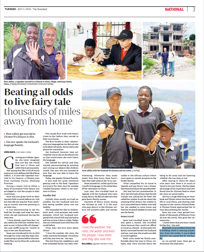 The Standard, the oldest newspaper in Kenya, spared a whole page to report the story of Rose Adikin, a Ugandan girl who married a Chinese man and becomes internet celebrity in China, on July 2.