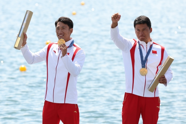 Ji Bowen from Huzhou, Zhejiang province, clinched the gold medal with his partner Liu Hao in the men's canoe double 500m at the Paris Olympics on Aug 8, with a time of 1 minute 39.48 seconds.