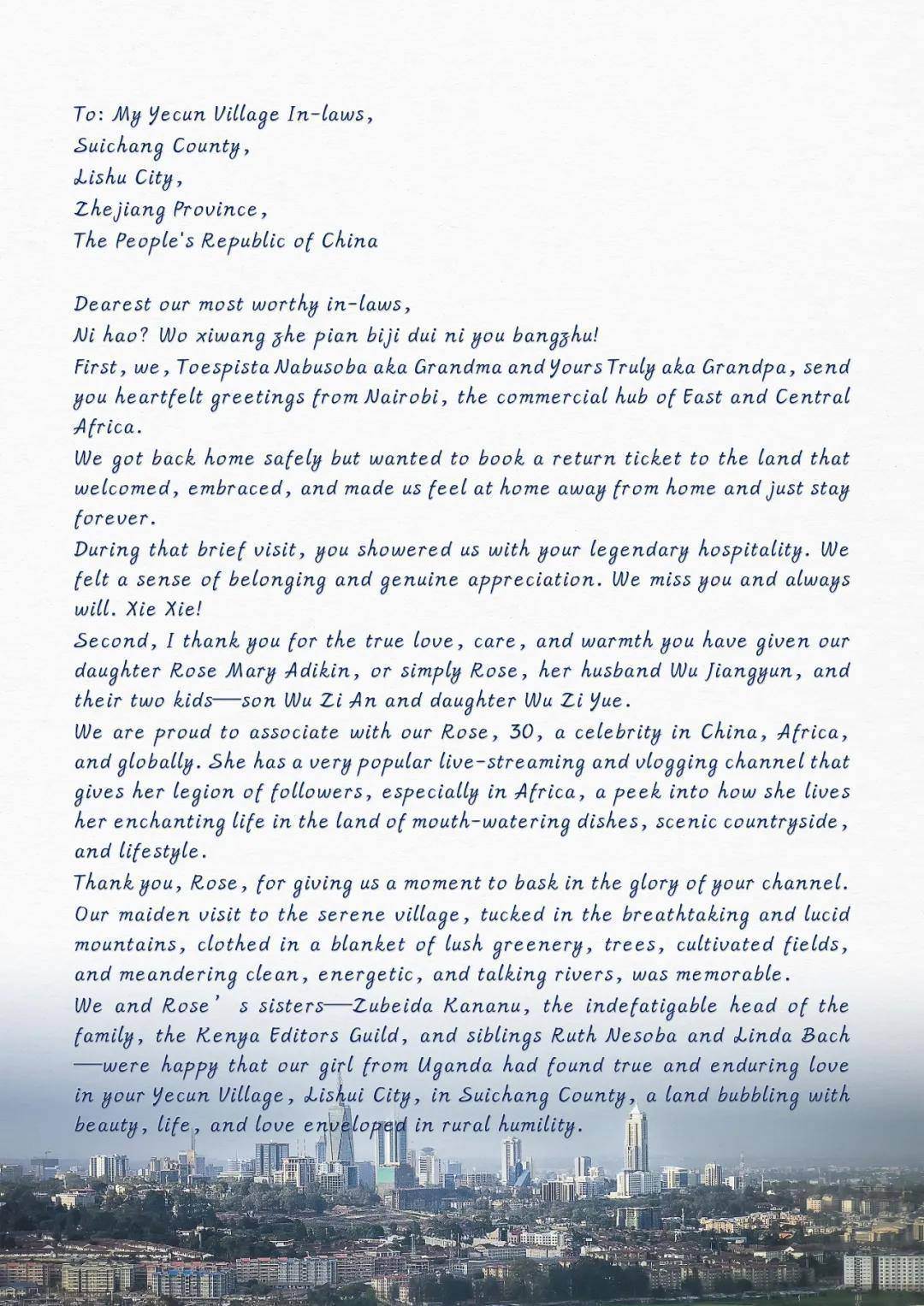 "We were happy that our girl from Uganda had found true and enduring love in your Yecun village, a land bubbling with beauty, life, and love enveloped in rural humility," said Bosire in his letter.