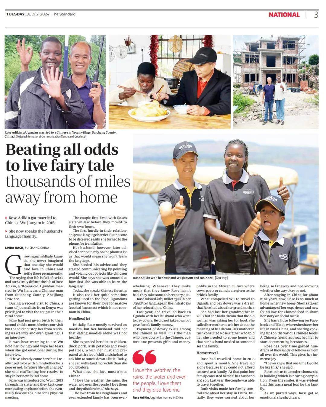 Linda Bach, a member of the delegation, sent back her report on Rose's family posted on The Standard, the oldest newspaper in Kenya. Titled Beating all odds to live fairy tale thousands of miles away from home, the report shared a thorough insight on Rose's life in China.
