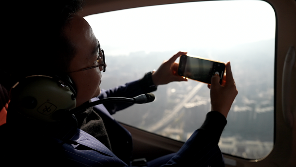 A passenger takes snaps of Hangzhou's urban landscape during his flight to West Hangzhou Railway Station. [Photo/tidenews.com.cn]