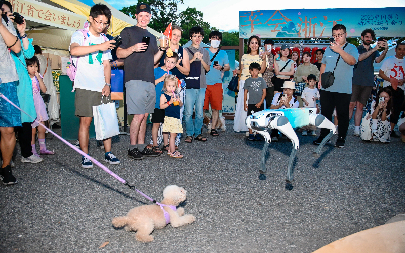 Visitors watch as a pet dog reacts to a robot dog at Yoyogi Park in Tokyo on Sept 6. [Photo provided to ezhejiang.gov.cn]