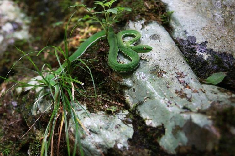 A viper lies in wait for prey along a riverbank at Qianjiangyuan National Forest Park in Zhejiang province on July 4, 2025. [Photo/IC]