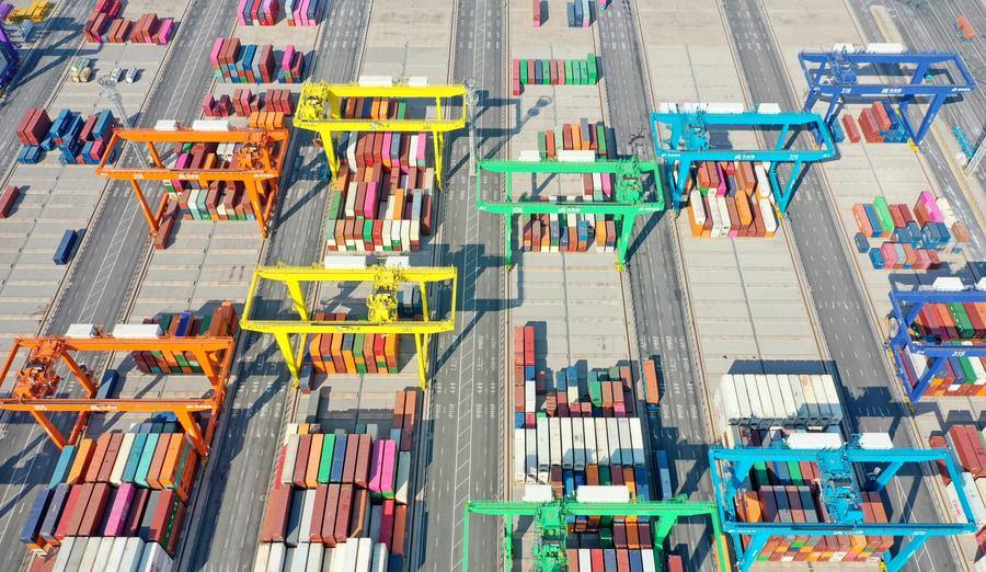 This aerial photo taken on Feb. 21, 2023 shows the full Internet of Things container terminal of Tianjin Port in north China's Tianjin. (Xinhua/Zhao Zishuo)