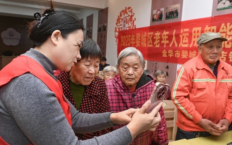 A volunteer teaches elderly residents how to use a smartphone in Wucheng district, Jinhua, Zhejiang province, on Nov 13, 2025. [Photo/IC]