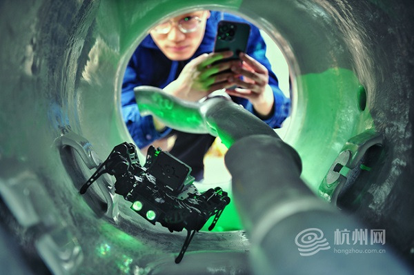 A palm-sized six-leg inspection robot is on duty inside a power pipeline. [Photo/hangzhou.com.cn]