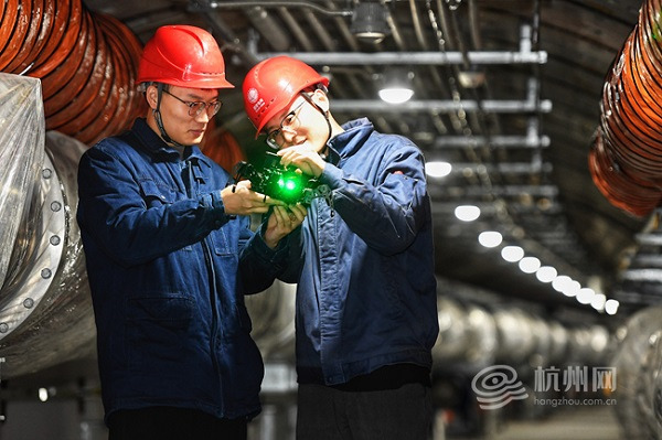Two engineers check the inspection robot. [Photo/hangzhou.com.cn]