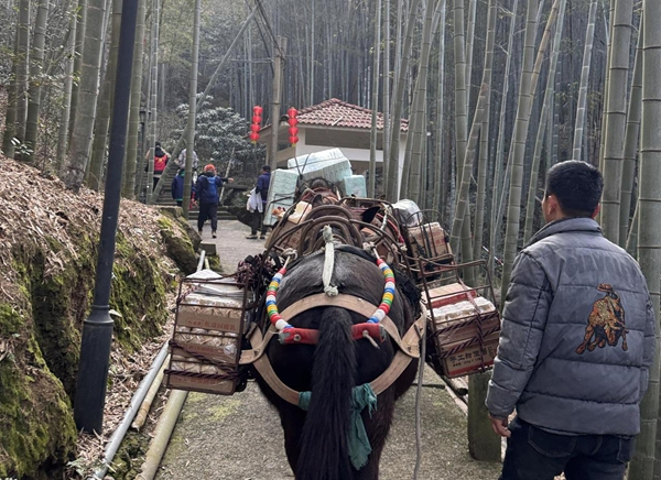 Starting from Shuangye village in Xialyu town, Keqiao district, volunteers used three mules to carry soy sauce, rice vinegar, fermented tofu, and other Spring Festival gifts up a steep 1,046-step mountain path. Yejia Mountain rises more than 470 meters above sea level and is home to a small number of elderly residents. The trip was organized by Ji Guomiao, chairman of Zhejiang Songshengyuan Food Co, together with several volunteer teams.