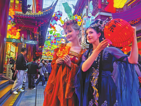 Tourists from Russia dressed in hanfu, or traditional Chinese attire, pose for photos at the Yuyuan Garden Lantern Festival on Thursday. The festival, which opened on Jan 26, has drawn a large number of foreign visitors with its rich traditional Chinese cultural elements. YANG JIANZHENG/FOR CHINA DAILY