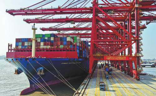 Containers are loaded onto a cargo vessel at Ningbo-Zhoushan Port in Ningbo, Zhejiang province. [Photo provided to chinadaily.com.cn]