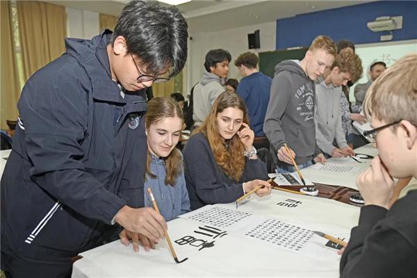 Students from Dueren learn calligraphy with Jinhua students. [Photo/Jinhua Media Group]