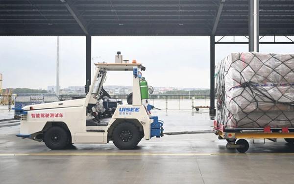 An unmanned apron vehicle is parked at the cargo terminal of Hangzhou International Airport on March 13, 2025. [Photo/IC]