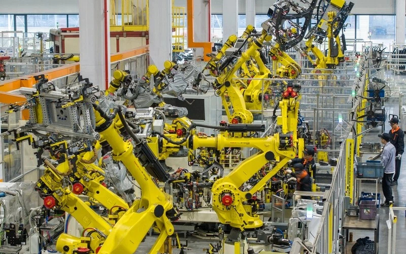 Nearly 200 robotic arms operate in an orderly manner at an auto parts company in Huzhou, Zhejiang province, on April 16. [Photo/IC]
