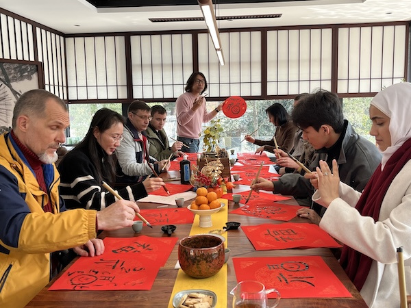 The highlight was the calligraphy session, where they wrote the character for "fortune" and added their own wishes in their native languages on red paper. This activity allowed them to appreciate the beautiful connotations of Chinese traditional culture.