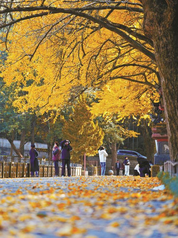 Along the temple's gingko avenue, more than 200 ancient trees form a dazzling "golden corridor", their leaves carpeting the stone paths in radiant yellow. By the Wanggong Pond, the shimmering reflections of gingko trees blend harmoniously with centuries-old camphors, creating a scene of timeless beauty.