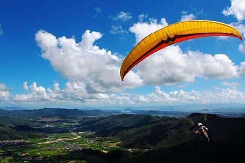 A tourist soars through the blue sky and white clouds on a paraglider. [Photo/Tide News]