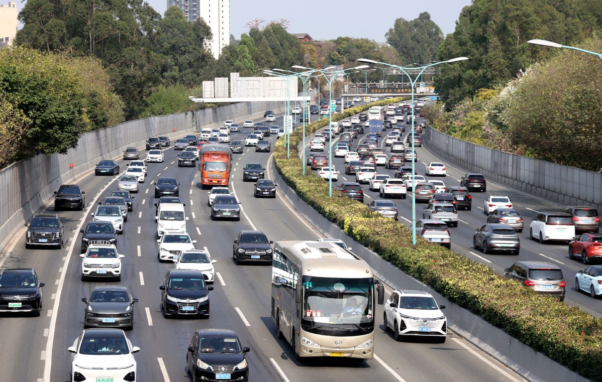 This photo taken on Feb 23, 2026 shows the traffic flow on a ring expressway in Guangzhou, South China's Guangdong province. [Photo/Xinhua]