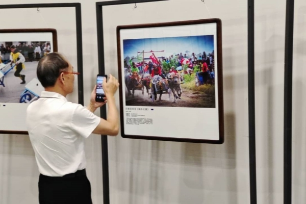 A visitor takes a picture of a work at the folklore photography exhibition in Huangyan. [Photo/taizhou.com.cn]