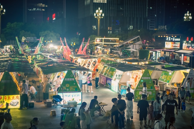 As night falls, vendors start to gather at a public square in Deqing county of Huzhou, East China's Zhejiang province. Selling products varying from local specialties to daily necessities, they have caught the eye of visitors.