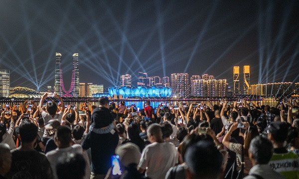 People gather at the promenade of Qiantang River to watch the light show of the Hangzhou Olympic Sports Centre Stadium, ahead of the 2022 Asian Games in Hangzhou in East China's Zhejiang Province on September 19, 2023.