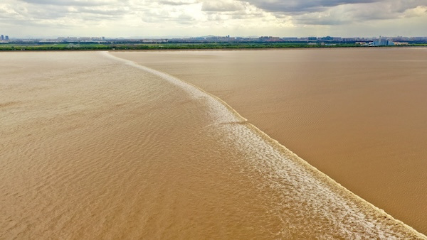An aerial view of the tidal bore in the Qiantang River in Haining, a county-level city of Jiaxing, on Aug 21. [Photo/tidenews.com.cn]