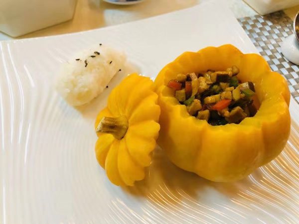 A small pumpkin filled with stuffing, a popular dish in Hangzhou (Photo provided to chinadaily.com.cn)
