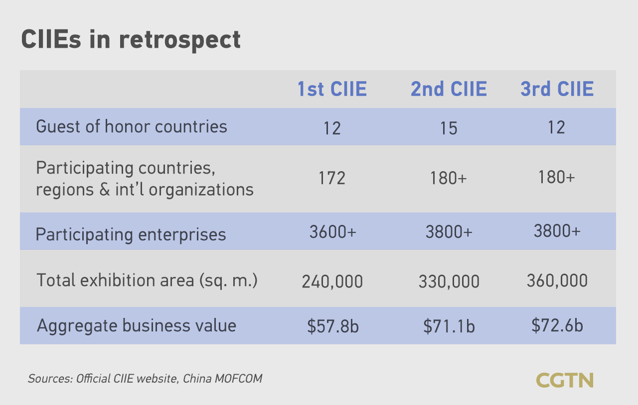 The first CIIE attracted over 400,000 buyers from home and abroad to Shanghai, the second CIIE witnessed the signing of tentative deals worth over $70 billion, and last year, over 3,800 enterprises from over 180 countries, regions, and international organizations attended the third CIIE, during which 411 new products, technologies, and services were exhibited.