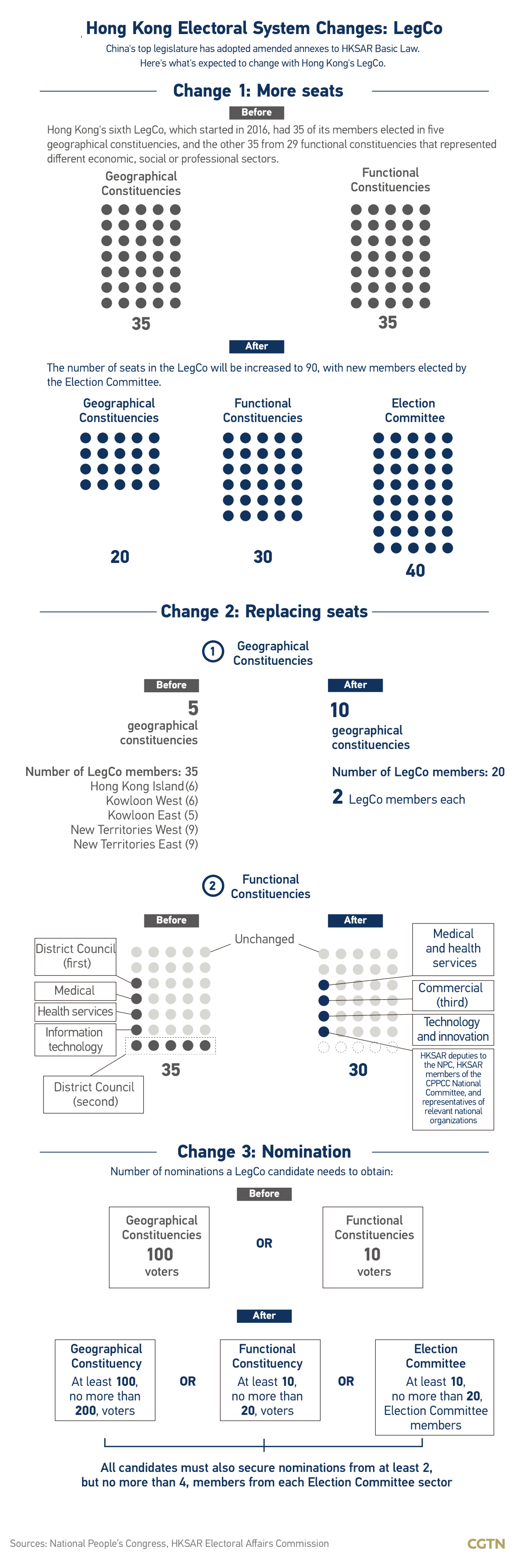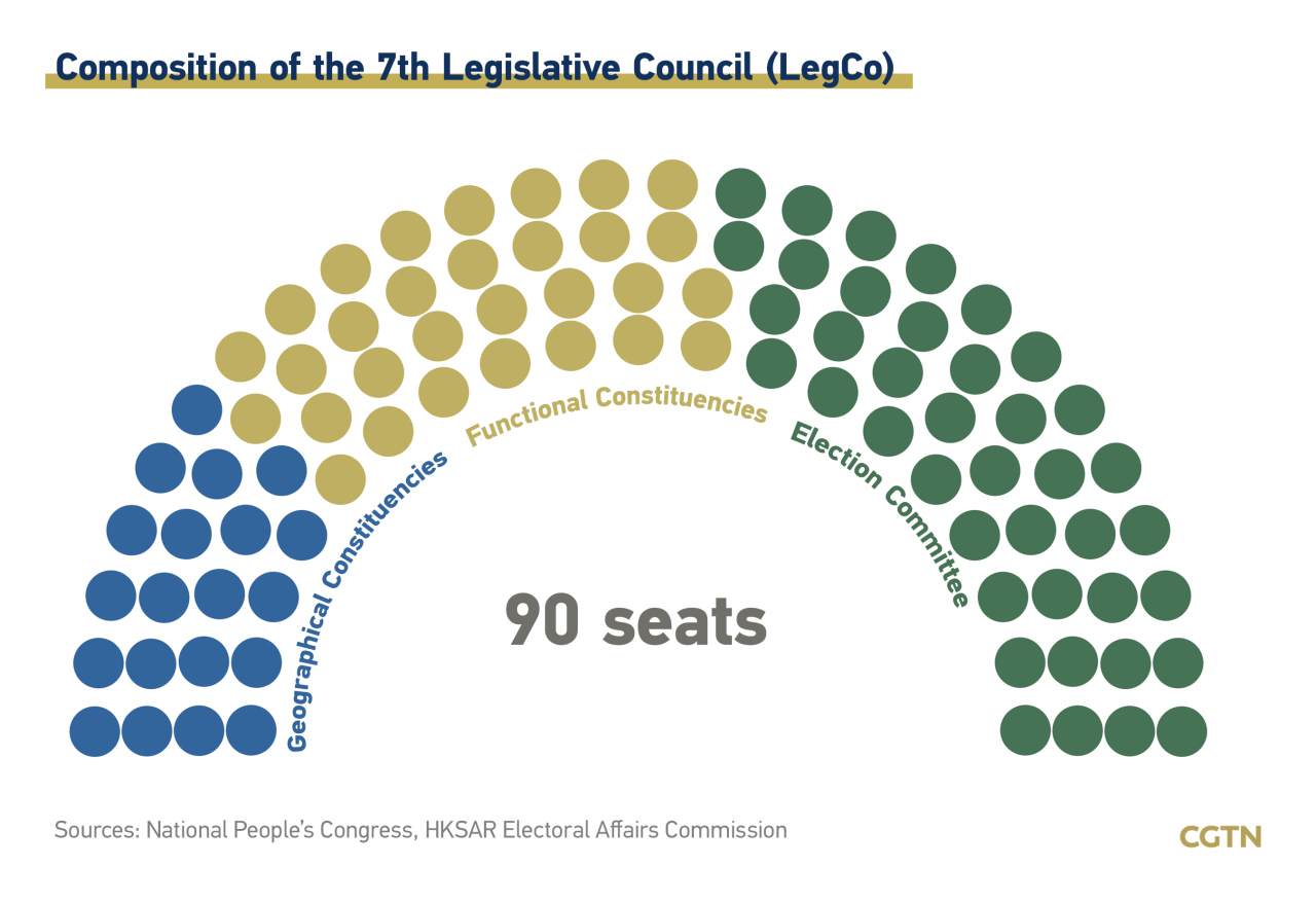 The membership of the seventh term of the HKSAR LegCo will increase from 70 to 90, and the members are to be elected by the Election Committee constituency (40 seats), functional constituencies (30 seats), and geographical constituencies (20 seats), respectively.