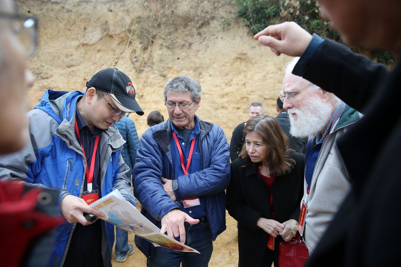 2017年12月12日,国际考古大咖实地考察良渚古城外围水利系统老虎岭水坝。视觉中国