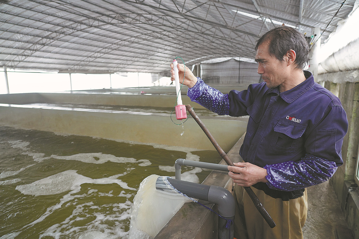 A technician works at one of the Yueqing Jinzhi Aquatic Seedling Company's clam seedling farms. (Photo/ Cai Kuanyuan)