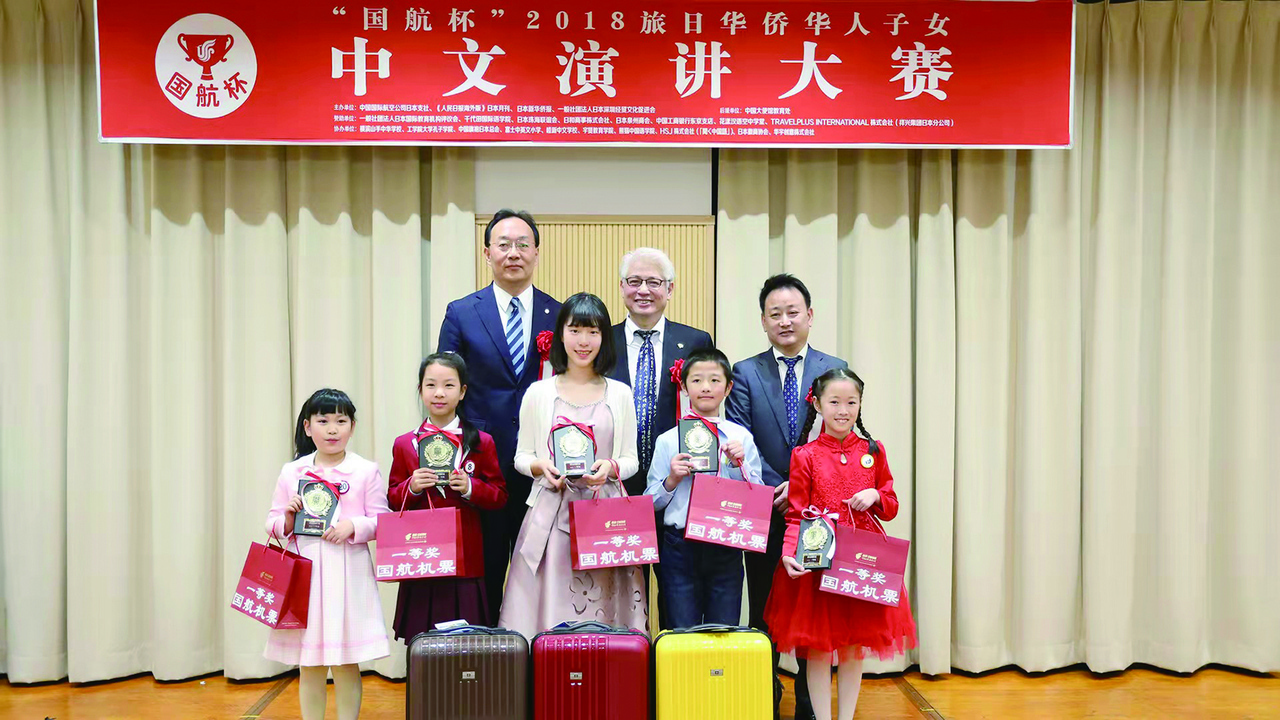 The author takes a group photo with winners of the 2018 Chinese Speech Contest for the Children of Overseas Chinese in Japan