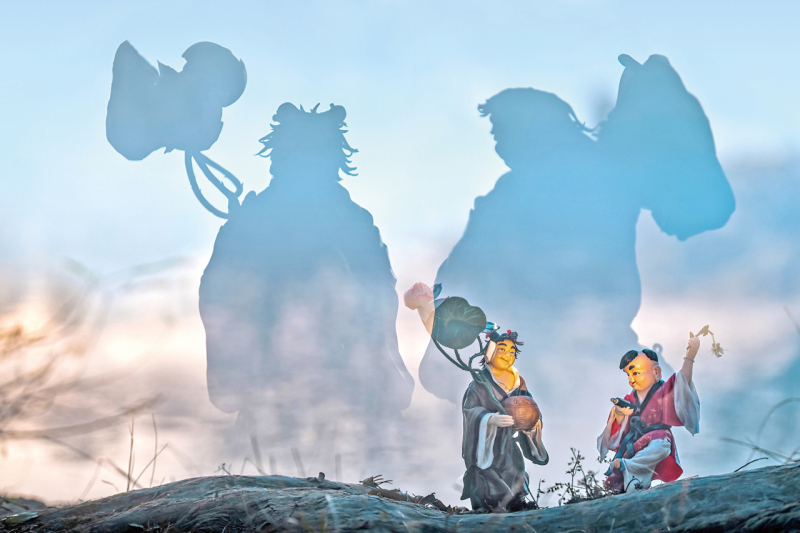 Nowadays, in Taizhou, images of the “Two Gods of Hehe” can be seen everywhere, in which one holds a lotus flower as a gift and the other holds a treasure box as a present to greet each other, showing their friendship, mutual respect and love, and harmonious coexistence. As both “lotus” and “box” have the same pronunciation as “he”, they have often been used to symbolize harmony and happiness.