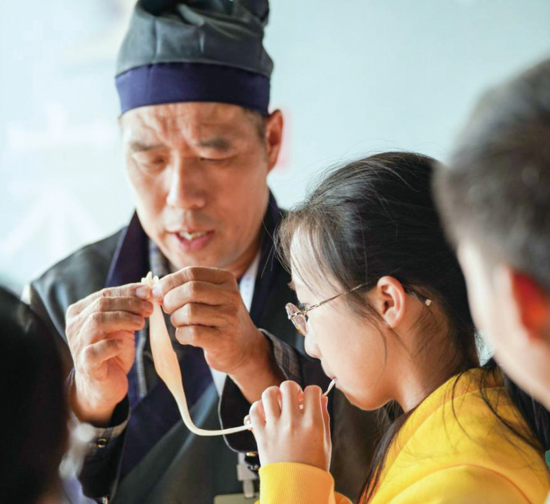 A girl tries to blow a sugar figure at the intangible cultural heritage fair of the 2021 Song Dynasty Culture Festival. Sugar-figure blowing is a traditional Chinese folk art.